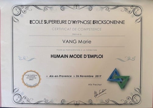 - Hypnose Ericksonienne Maître praticien, PNL, EMDR+ ; à l’ESHE Coalix académie Aix en Provence;
